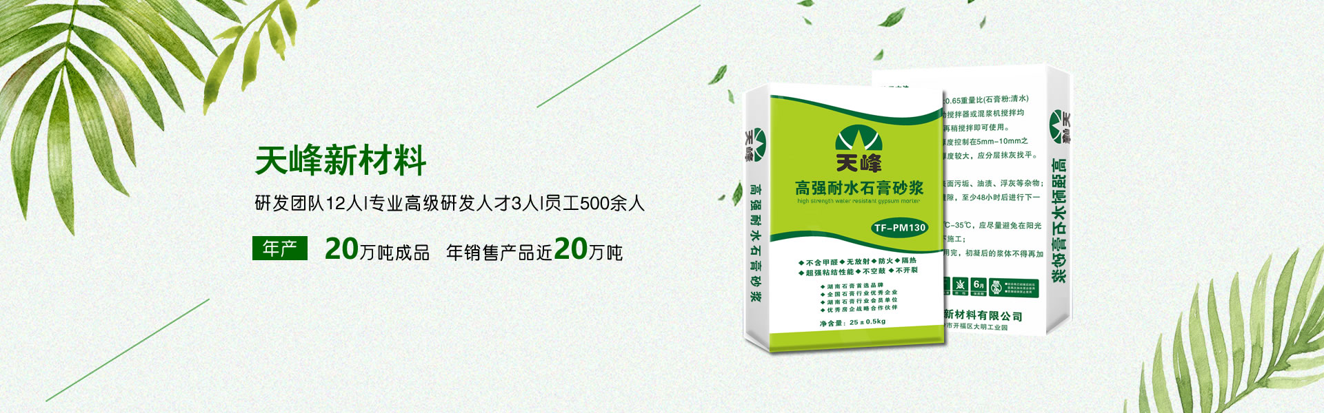 湖南天峰新材料有限公司成立于2020年,注冊資金1080萬元整,是一家專業從事石膏砂漿,石膏基建筑材料輔料,特種砂漿,混凝土外加劑的研發,生產,銷售及裝飾裝修專業分包的企業。依托湖南大學、中南大學專家教授團隊,擁有雄厚的技術實力,現有研發團隊12人,專業高級研發人才3人,員工500余人,年生產能力20萬噸成品,年銷售產品近20萬噸。 未來三至五年內,公司規劃在北京、武漢、廣州、上海、成都、西安、鄭州等地建立產品制造基地及相應的商務中心,技術研發中心,產品制造及銷售服務平臺,向客戶提供可靠的服務和支持,同時建立創新的伙伴關系,全面實施國家的藍天環保戰略。